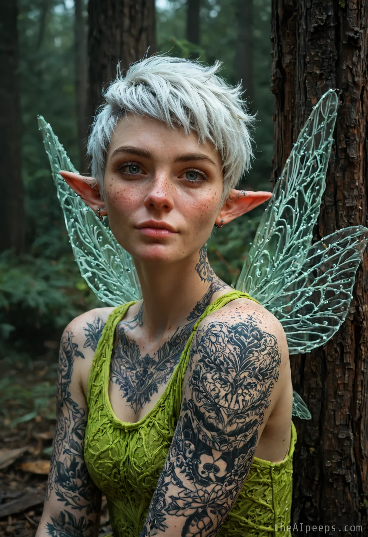 Standing four feet tall, the wood elf is a vision of displaced forest grace. Her skin is a map of bronze freckles, dominated by static silver and gold tattoos etched permanently across her athletic frame like inlaid metal. These bold, unmoving geometric patterns wrap her limbs, catching the roomβs ethereal light like polished jewelry.
